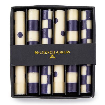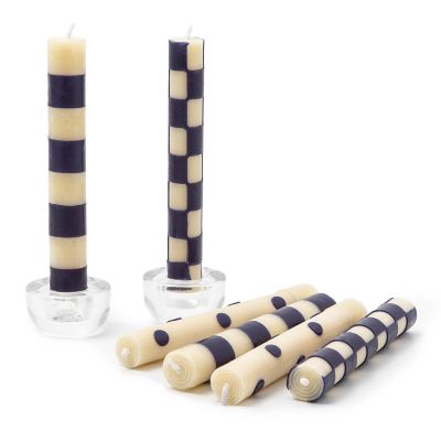This set of six beeswax-blend mini dinner candles, featuring appliqued check, stripe, and dot patterns in royal blue, is an enlightening addition to your table or mantel.