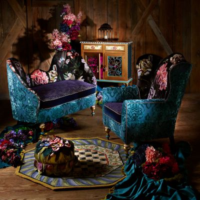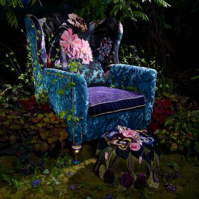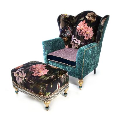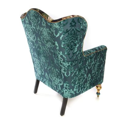 We’re not ones to keep this delicious detail to ourselves. The Moonlight Garden Off the Record Wing Chair is in full bloom, featuring a dark and delicious floral velvet print, reminiscent of an Old Masters painting, over a domestic hardwood frame. Contrasting fabrics include a flocked teal velvet brocade on the sides and a violet velvet boucle on the loose cushion, trimmed with harlequin check cording in navy and gold. The chair’s front legs get their personality from our artisans in Aurora, New York, who have masterfully added hand-painting, gold leaf, and transfers.