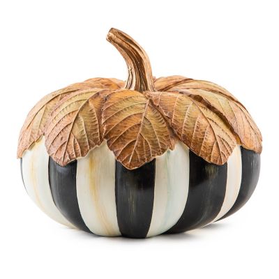 Our pumpkin patch is filled with extraordinary picks, including this medium foliage pumpkin, featuring a hand-painted pattern of Courtly Stripe, topped with leaves in muted shades of gold and accented with a copper-finished stem.