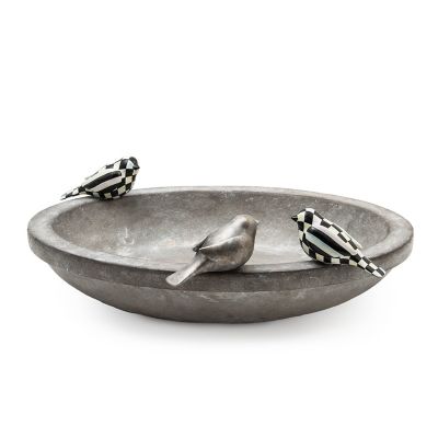 Splish splash, our Naturals Bird Bath is made of resin with a weather-resistant, concrete-style finish. It features three affixed birds decorated in our signature patterns. Fill it with a little water for the real birds or place a plant inside.