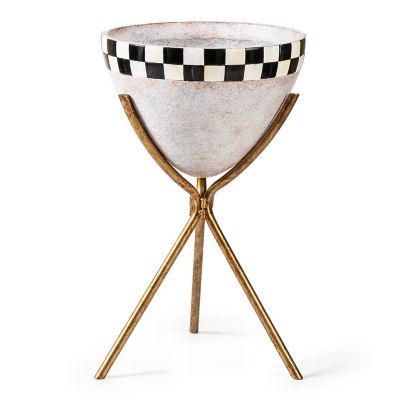 Display your plants in MacKenzie-Childs style in this small planter with a stoneware terra cotta finish, accented with a band of Courtly Check®. It fits into an accompanying metal stand. Display in a protected location only.