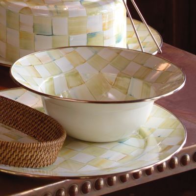 Parchment Check™ serving pieces make the perfect gift; equally at home with formal or informal environments, in town or at your cottage. The comfort food of tableware, Parchment Check™ is cheerful and sunny-yet deliberately soft and simple-with a blend of parchment, taupe, gold, and an irrepressible touch of aqua woven by an artisan’s brush through the glossy, hand-painted checks.