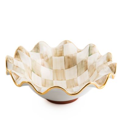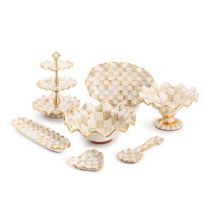 Understated and elegant, with just the right hint of jest, each piece is handmade, hand-painted, and requires four kiln firings. Color-dragged checks blend parchment, taupe, gold, and an irrepressible touch of aqua. Hand-applied gold lustre edges and accents. Turn each piece over and you’ll see the stamps of the artisans who created it.