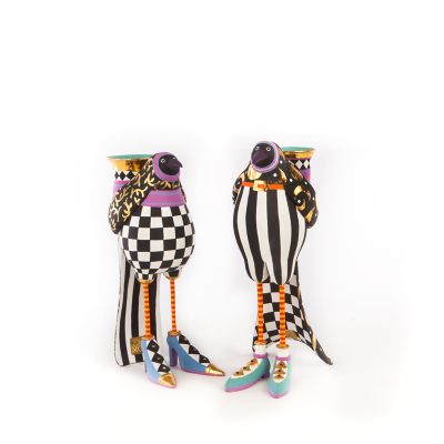 Enhance the ambience of candlelight with the Patience Brewster Carl Crow Candle Holder. Carl’s body is decorated with a mix of patterns, including stripes on his body and gold-leafed moons and stars on his wings. His candle holder, decorated with checks and harlequin diamonds, holds a dinner candle.