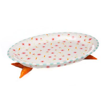 Serve up something special with whimsy on the side with the Patience Brewster Carrot Footed Hors D’Oeuvre Plate. This ceramic plate is hand-painted in pink blossoms, trimmed with blue stripes, and sits on carrot-shaped feet.