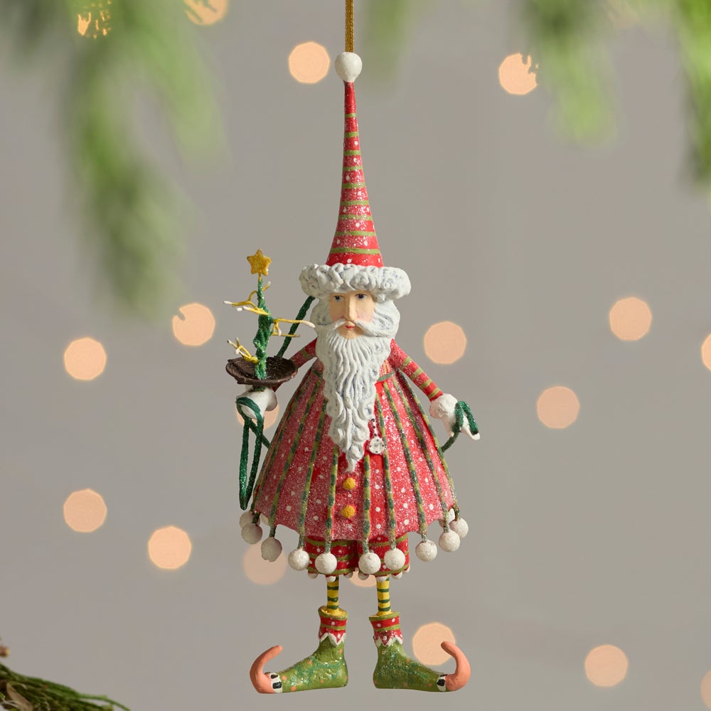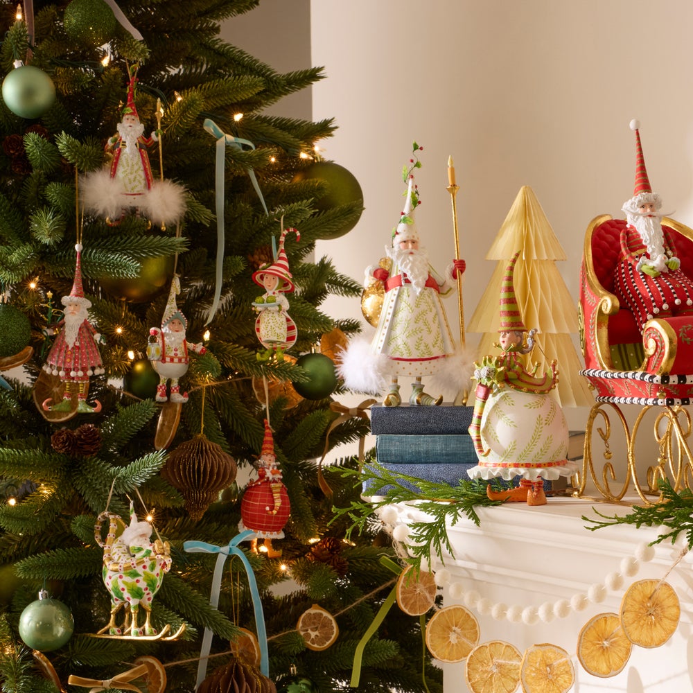Dash Away, inspired by the Christmas classic “’Twas the Night Before Christmas,” features Santa’s eight reindeer ready to take flight around the world, assisted by their delightfully dedicated elves, Santa, and Mrs. Santa. The Patience Brewster Dash Away Dashing Santa Ornament features Santa reminding his reindeer to dash away to your house on Christmas Eve. Dressed in a red suit detailed with tiny checks, stripes, and dots, he keeps his pocket watch handy and carries a star-topped tree in a tiny twig nest.