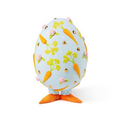 The Blue With Carrots Patience Brewster Egg is egg-ceptional! Fresh as spring, this hand-painted resin egg has carrot feet and is decorated with raised petite roses, carrots, and gold foil dots. Display it with the White With Radishes Patience Brewster Egg and the Pink With Snow Peas Patience Brewster Egg.