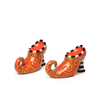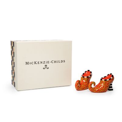 Add a little spice with the Patience Brewster High Heel Shoe Salt & Pepper Set. These ceramic shakers feature Patience’s whimsical shoe design with green swirls on red, topped with black and white stripes and gold lustre. Fun and festive, and just the thing to kick up your heels.