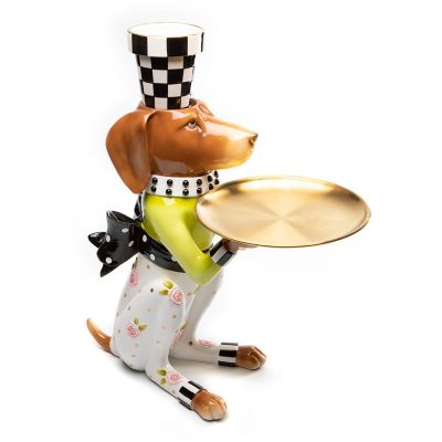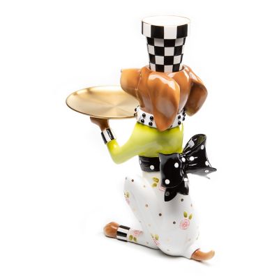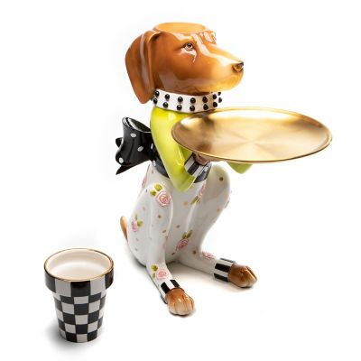 The Patience Brewster Really Rosy Pointsittier Butler is at your service. This helpful, hand-painted hound is decorated in our Really Rosy pattern. He holds a golden food-safe platter, and there’s a removable checked flower pot on his head.