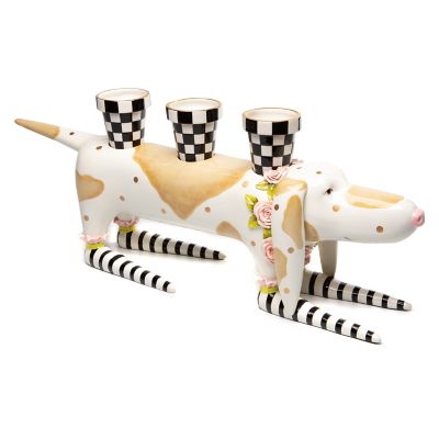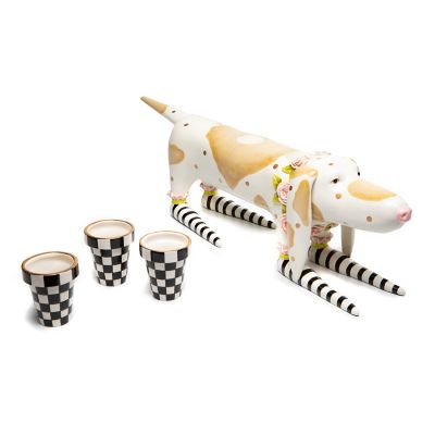 Present your posies with style in the Patience Brewster Rosy Hound Planter. This helpful hound is sure to make you smile, decorated in dimensional pink roses and dots of gold lustre. He carries three removable checked flower pots that can hold your plants, silverware or snacks!