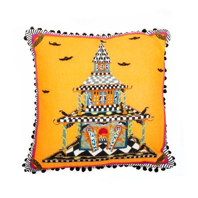 It’s all treats, no tricks when you play up the spirits of the season with our comfortable and charming Halloween pillows. The Patience Brewster Spooky House Pillow features Patience’s spectacular Spooky House design, embellished with beads and embroidery on a cotton-linen front. The finishing touch is a striped fabric border and black pom-poms around the edges.