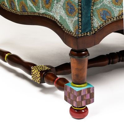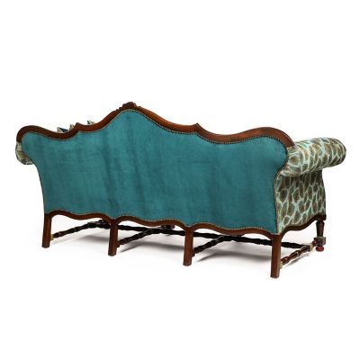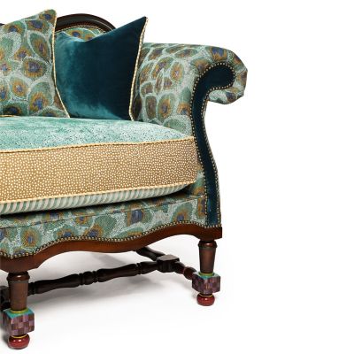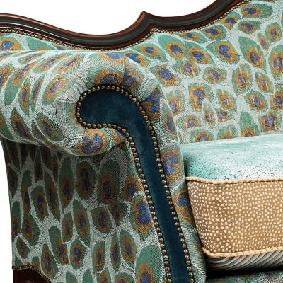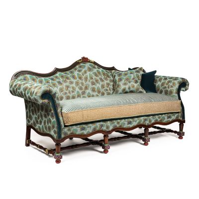 Our one-of-a-kind, generously sized Peacock Sofa adds more than a bit of panache to any interior. Its domestic mahogany frame, embellished with hand-painting from our Aurora artisans, is dressed in a woven peacock feather print and topped with a loose cushion that reverses from aqua to teal, trimmed with striped velvet boxing and stitched harlequin cording. The back is a star as well, covered with teal velvet and finished with antique brass nailheads. Includes two throw pillows that reverse from peacock feather print to teal.