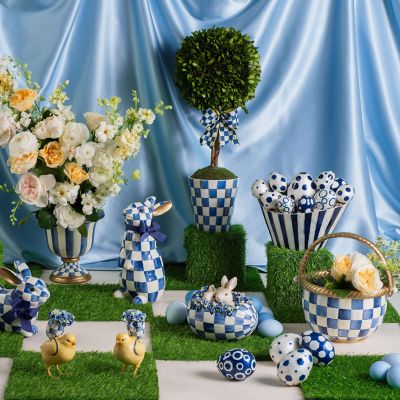Our Peekablue Egg simply says springtime with two lively little bunnies popping out of a hand-painted Royal Check egg embellished with blue paper flowers.