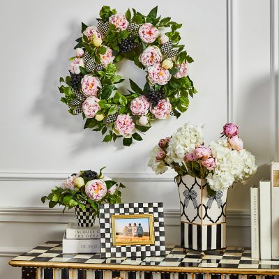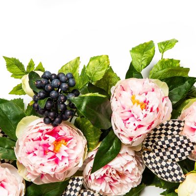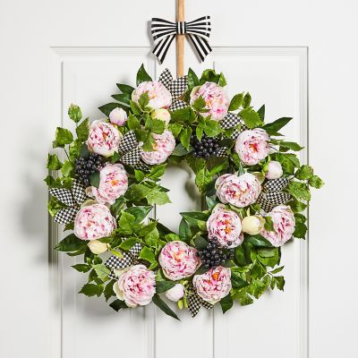 Beautiful peonies bloom perpetually with the Peony Wreath, with everlasting pink peony florals on a backdrop of green and Courtly Check® leaves, accented with berry clusters. Hang this in a protected location only.