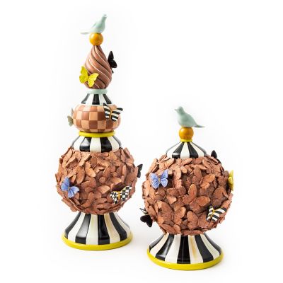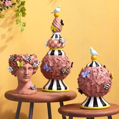 The Large Persephone Topiary is décor for the great outdoors but is suited for the indoors, too. Made of resin with a terra cotta finish, these stacked spheres feature three-dimensional butterflies on a hand-painted Courtly Striped base, topped with a bird finial. Combine it with the Small Persephone Topiary to create a unique landscape.