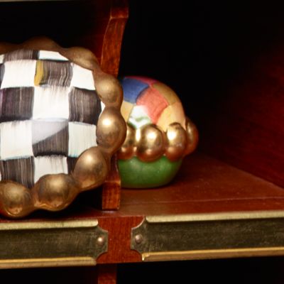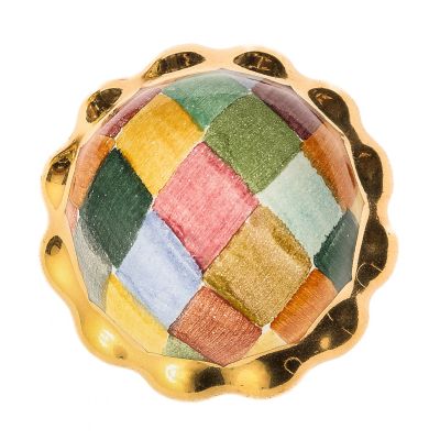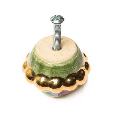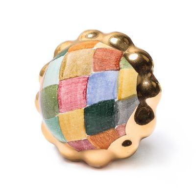 A bold, rich harlequin pattern is hand-painted onto this petite ceramic scalloped silhouette. Crafted using age-old techniques, fired in a series of kilns, and adorned with meticulous brushstrokes. A wide, glittering band of gold lustre frames each one-of-a-kind Harlequin Petit Four Round Knob. With fresh yet timeless palettes painted onto gracefully curved globes and scalloped edges, Petit Four Round Knobs mix and match wonderfully with each other and other knob patterns to brighten any space with a style all your own.