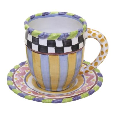 From a piping-hot cup of joe between morning meetings to the frothy draught of steamed milk to soothe a sleepy tummy, the Piccadilly Mug adds a dash of extraordinary to the everyday. Made of majolica and hand-painted by our master artisans with a delectable design of stripes, squiggles, and checks in carnival colors, this one-of-a-kind piece is especially sweet paired with hearty pour of cocoa. Each handcrafted piece bears the stamps of the artisans who created it. Oven and dishwasher friendly.