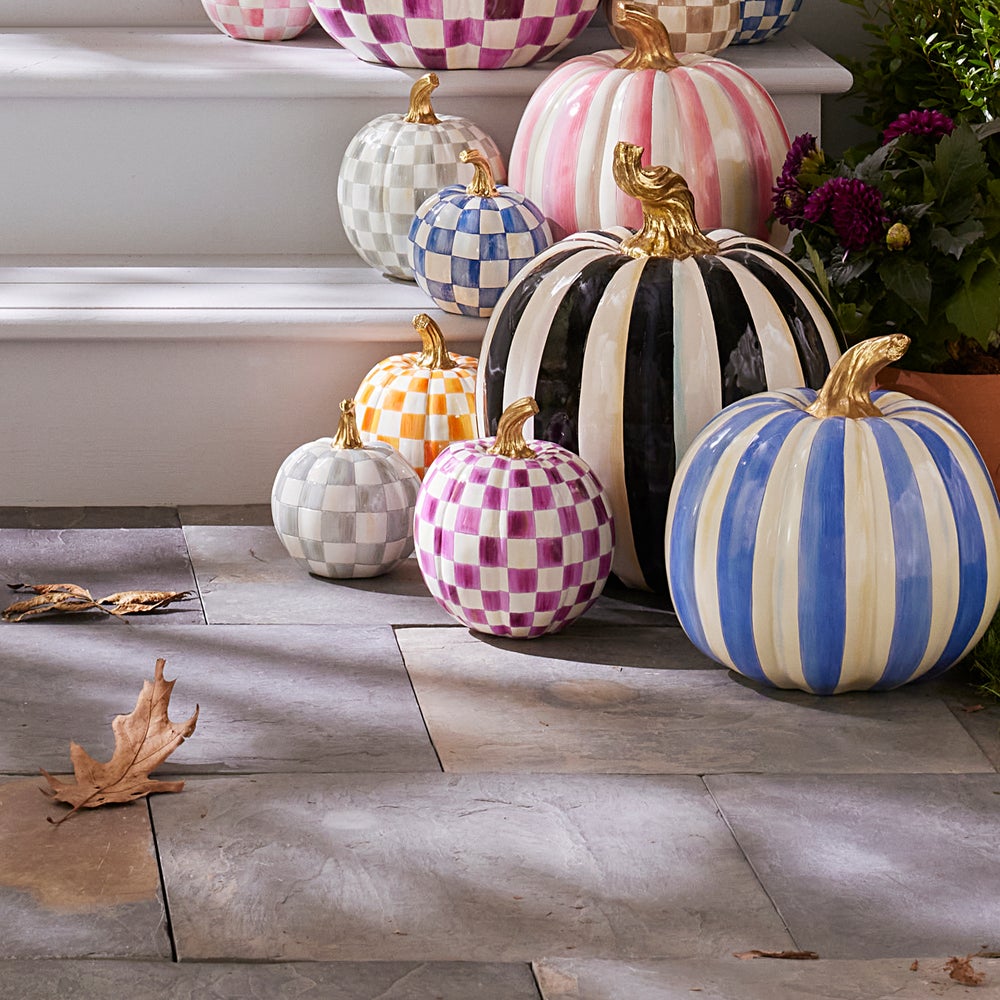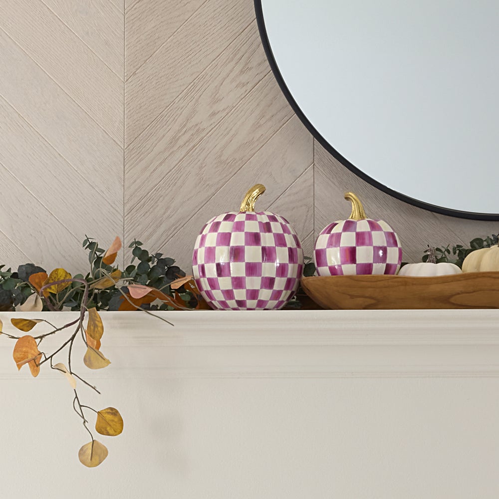 Take your pick from our most unusual pumpkin patch with the Plum Check Small Pumpkin, hand-painted with Plum Check and trimmed with a gold leaf stem.