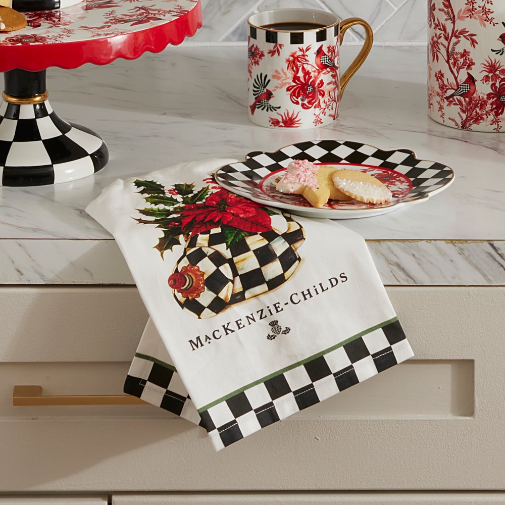 Fun and functional, this printed dish towel, featuring poinsettias on our Courtly Check® Tea Kettle, plus our distinctive logo, spreads holiday cheer in the kitchen.
