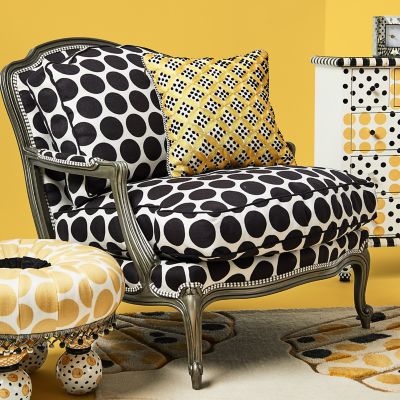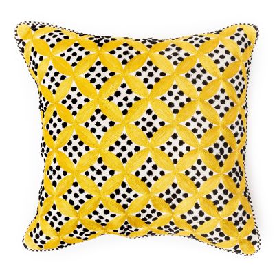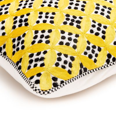 Make a vivid statement with our embroidered Point Counter Point Pillow. A grid of yellow petals is accented with black dots, trimmed with black and white check piping. Pairs perfectly with our Spot On collection and adds some graphic fun to our Queen Bee collection.