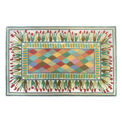 The 5′ x 8′ Poplar Ridge Rug features one of our classic Taylor ceramic patterns, bringing its color and charm to your floors. This wool-blend, hand-tufted rug is a mishmash of florals, diamonds, and stripes, and the pattern pays tribute to Poplar Ridge, a local spot that has spectacular views of Cayuga Lake from the hilltop just above Aurora. More interest comes from the weaving technique, where the blossoms are sculpted slightly higher, adding a bit of dimension.