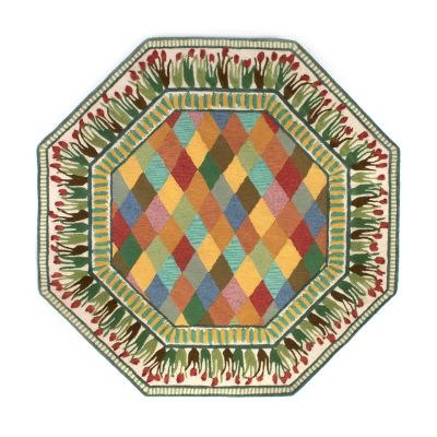 The 6′ Octagon Poplar Ridge Rug features one of our classic Taylor ceramic patterns, bringing its color and charm to your floors. This wool-blend, hand-tufted rug is a mishmash of florals, diamonds, and stripes, and the pattern pays tribute to Poplar Ridge, a local spot that has spectacular views of Cayuga Lake from the hilltop just above Aurora. More interest comes from the weaving technique, where the blossoms are sculpted slightly higher, adding a bit of dimension