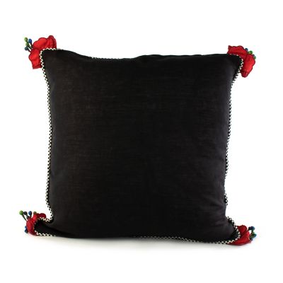Our Black Poppy Square Pillow is not only comfortable, it’s visually stunning. The hand-stitched flower petals virtually leap off the black background fabric. It’s embellished with embroidery, checked cording, and crinkle-silk flowers across the pillow and on each corner.