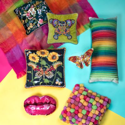 Blow a kiss to the Pucker Up Pillow, rendered in embroidery and sequins on a sateen front that’s backed with velvet. The lips are tufted in the center to give them added dimension.