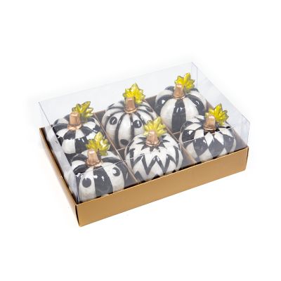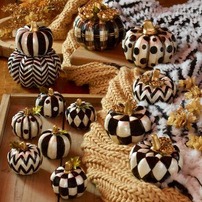 Harvest some style from our extraordinary pumpkin patch. Our playful patterns invite you to mix and match, creating a presentation of checks, dots, and stripes that’s uniquely yours. The Pumpkin Patch features a set of six petite capiz pumpkins in a variety of black and white patterns, topped with green leaves and golden stems.