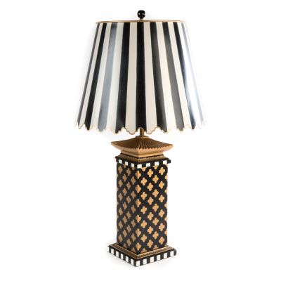 Beautiful black, white, and gold look grand in a room with a bold paint choice or well-honed color palette. Our Quatrefoil Large Table Lamp features ornate details like a honeyed gold patterned base and a striped shade with a scalloped edge.