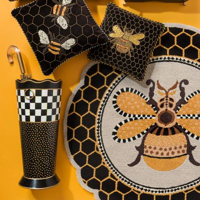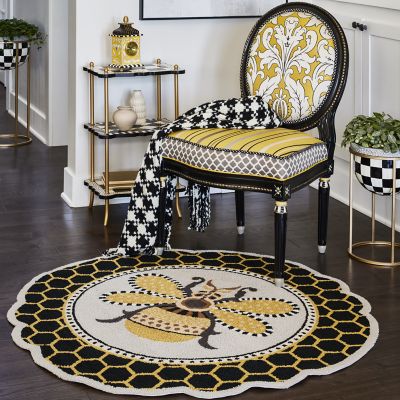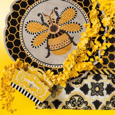 Bee inspired! The hooked 100% polyester 4′ Round Queen Bee Rug makes a welcoming statement that buzzes, featuring a magnificent winged wonder that’s trimmed with a scalloped honeycomb border.