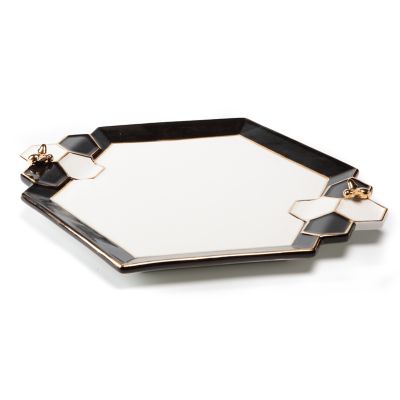 The ceramic Queen Bee Tray serves with style. Decorated in a modern black and white hive pattern, trimmed with gold lustre, it’s embellished with buzz-worthy bees on the handles. The surface is food-safe, too.