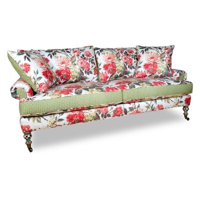 Experience the embrace of an English rose garden with our Really Rosy Sofa. This amply comfortable piece, featuring four loose cushions, is upholstered in a lush print of blooming roses that’s paired with a sage octagonal pattern on the decking. The hardwood frame rests on exposed hand-painted wooden legs on casters. Two coordinating reversible pillows are included.