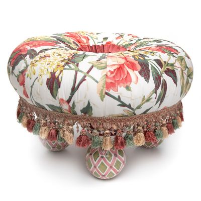 Experience the embrace of an English rose garden with our Really Rosy Tuffet. Dressed in a lush print of blooming roses, it’s embellished with a silk pleated ruff that surrounds a button covered with an octagonal sage print. Trimmed with tasseled fringe that’s accented with faceted beads, this playful perch sits on four handmade and hand-painted ceramic legs crafted by our artisans in Aurora, New York.