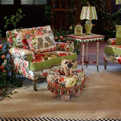 Experience the embrace of an English rose garden with our Really Rosy Tuffet. Dressed in a lush print of blooming roses, it’s embellished with a silk pleated ruff that surrounds a button covered with an octagonal sage print. Trimmed with tasseled fringe that’s accented with faceted beads, this playful perch sits on four handmade and hand-painted ceramic legs crafted by our artisans in Aurora, New York.