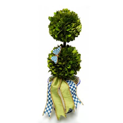 The preserved boxwood in our Medium Royal Boxwood Topiary is intricately woven together, looking effortlessly elegant in a ceramic base that’s decorated with an image of our Chicken Palace here on the farm that invokes classic blue chinoiserie style. A Royal Check butterfly and ribbon provide the finishing touches. Choose a pair to make a statement of style.