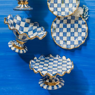 Footed, fluted, and fabulous, the Royal Check Compote holds peaches, plums, sweet buns, or anything else that deserves a place of honor in the Sunday brunch spread. Handmade and painted by the master hands of our Aurora, New York, artisans, this golden-edged compote will keep you coming back for more. A beautiful juxtaposition of blue hues, our deceptively simple signature checks reveal an intricate spectrum of jewel-toned colors. Handmade, fired, glazed, fired again, hand-painted, embellished with lustre, and fired again, each piece is stamped by the artisans involved in its creation. Each piece of Royal Check reflects the artisan’s hand, so no two are exactly alike, although they all work together in perfect harmony.