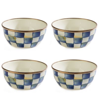 For masters of mise en place, our Royal Check Pinch Bowl makes prep work a stylish snap. With its just-right size and our blue and white checked pattern, this petite enamel pot is equally charming when brimming with paper clips in a home office or lemon wedges on the wet bar. The heavy-gauge steel underbody is glazed with hand-painted, color-dragged checks in a range of blue hues that are similar in theme to our popular Courtly Check® and rimmed in bronzed stainless steel.