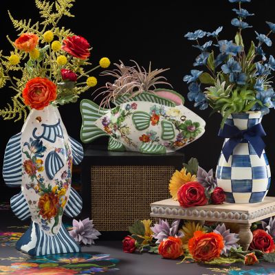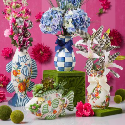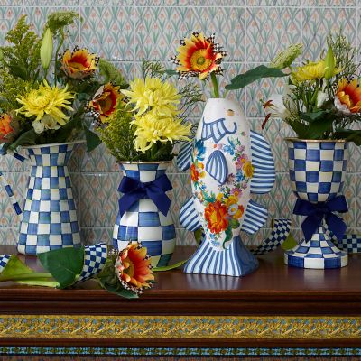 Farm-fresh and inspired by traditional glass milk jugs, the Tall Royal Check Vase is the kind of vase that’s just right for a casual wildflower bouquet, cherry-blossom branches or pussywillow stalks. Hand decorated enameled steel with a bronzed rim and tied up with a ribbon bow, you’ll find it’s almost just as pretty on its own!