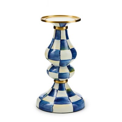 Make an enlightening statement of style by displaying your pillar candles on the Royal Check® Medium Pillar Candlestick. Made of a heavy-gauge, hand-glazed steel underbody with hand-painted blue checks, it’s embellished with brass accents and rimmed in bronzed stainless steel.