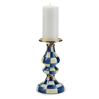Make an enlightening statement of style by displaying your pillar candles on the Royal Check® Medium Pillar Candlestick. Made of a heavy-gauge, hand-glazed steel underbody with hand-painted blue checks, it’s embellished with brass accents and rimmed in bronzed stainless steel.