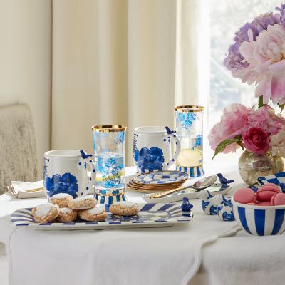 Make any occasion more special by setting the table with this set of two mouth-blown highball glasses. Featuring hand-applied blue floral transfers on a base of hand-painted Royal Stripe, they’re trimmed with gold lustre.