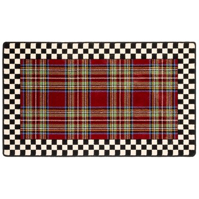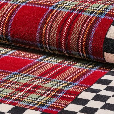 This wool-blend 3’ × 4’11″ red tartan rug is woven in Scotland, using the Axminister method, which is known for superior durability that comes from interweaving the pile and backing.