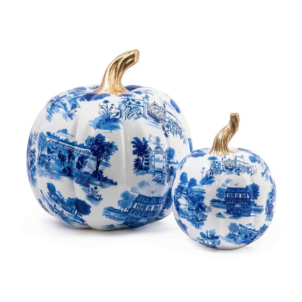 Our pumpkin patch is filled with extraordinary picks, including this small pumpkin, featuring a royal blue toile pattern of our Upstate New York estate, and topped with a gold leaf stem.