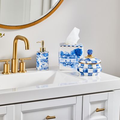 Make the powder room pretty with our ceramic Royal Toile Pump Dispenser. It’s perfect for dressing up an ordinary bottle of hand soap and is decorated with landmarks from our Aurora campus with Royal Check on top.