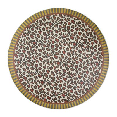 The 6′ Round Serengeti Floor Mat lets you literally walk on the wild side. Made of durable, slip-resistant vinyl, it features a pattern of animal spots, finished with a striped border.