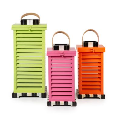 Illuminate the outdoors after dark with the Orange Small Shutter Lantern. Its slated pattern becomes positively playful when a battery-operated flicker candle is placed into the wooden lantern that’s decorated with Courtly Stripe on the top and bottom. Please, display in a protected location only.