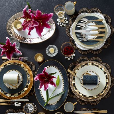 Our SoHo collection is anything but basic, mixing the traditions of handmade porcelain with modern technology and design. Handcrafted in Portugal, the Platinum SoHo Serving Platter makes for a sleek and stylish tabletop presentation. It features a textured surface created by random drops of wax that burn off after firing, leaving a combination of matte and glossy surfaces, which gives each piece its own unique personality. It’s finished with hand-applied gold lustre and Courtly Check® transfers.