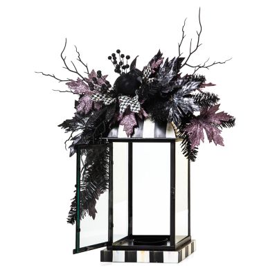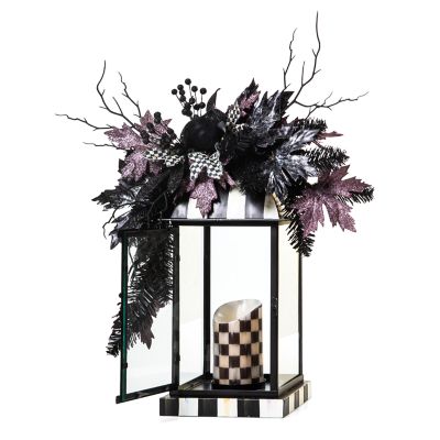 Set the scene for Halloween with this lantern arrangement, featuring a grapevine base, embellished with everlasting purple and silver florals, Courtly Check® ribbon, and crowned with a glittering tin witch on a Courtly Check moon.