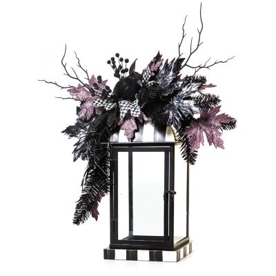 Set the scene for Halloween with this lantern arrangement, featuring a grapevine base, embellished with everlasting purple and silver florals, Courtly Check® ribbon, and crowned with a glittering tin witch on a Courtly Check moon.